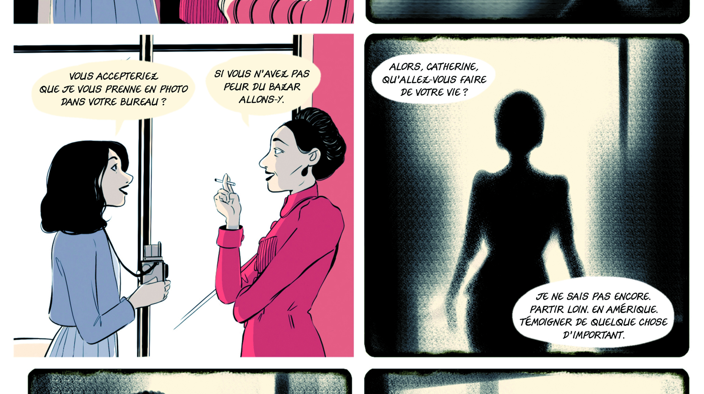 Elle scrute avec délice comment un dessinateur de BD imagine de but en blanc une photo ou ses variantes. Et prend plus de plaisir encore quand ces fausses ou vraies photos paradoxalement influent sur la propre vie de l’auteur-dessinateur de BD (cas d’une bd autobiographique comme celles de Paco Roca, de Xoana Pousa et de Maria Herreros ) ou sur l’intimité du personnage qu’il invente comme dans la BD de Julia Billet / Mayalen Goust.